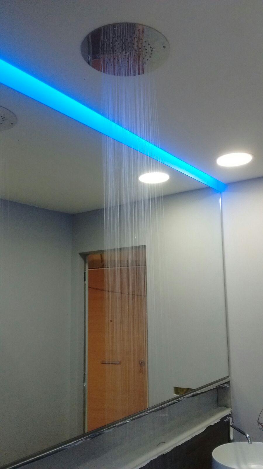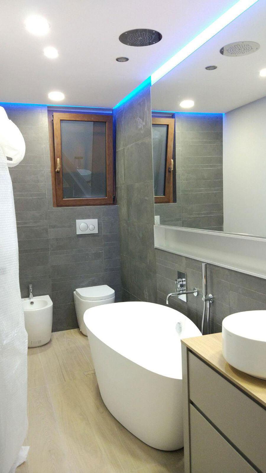 Suministro: Grifería Gessi Via Tortona, ducha de techo Bossini, revestimiento gris Abk Docks, mobiliario Compab