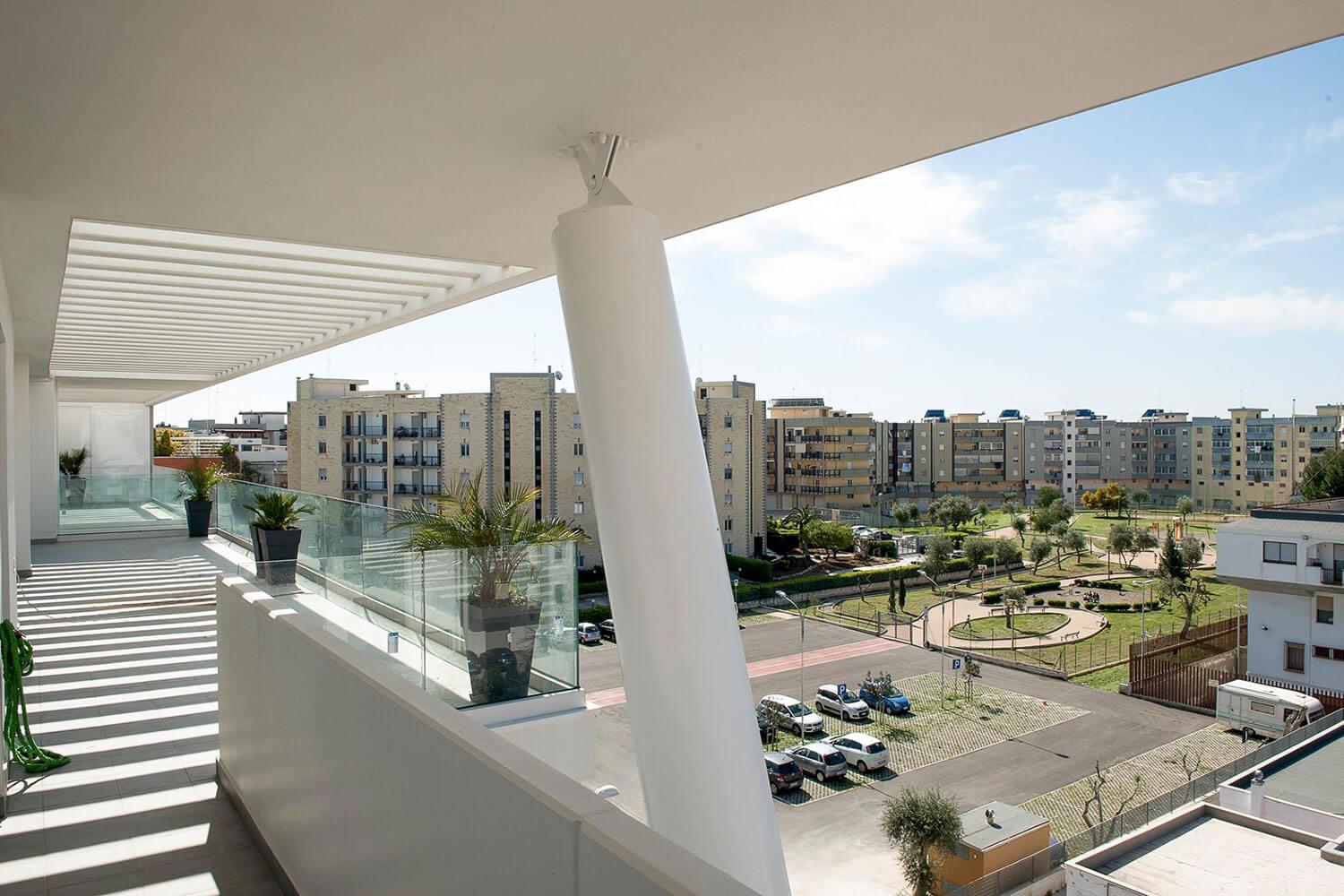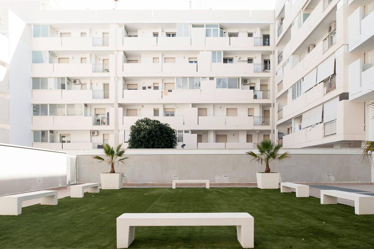 En concreto, la planta baja de doble altura está destinada a actividades comerciales con vistas a dos bulevares peatonales, con equipamiento urbano verde y bancos y amplios aparcamientos a nivel público con un parque en el patio. Los volúmenes, los voladizos, los grandes ventanales y los balcones aterrazados con una fuerte presencia de vegetación permiten vivir la intimidad de la villa en el apartamento.